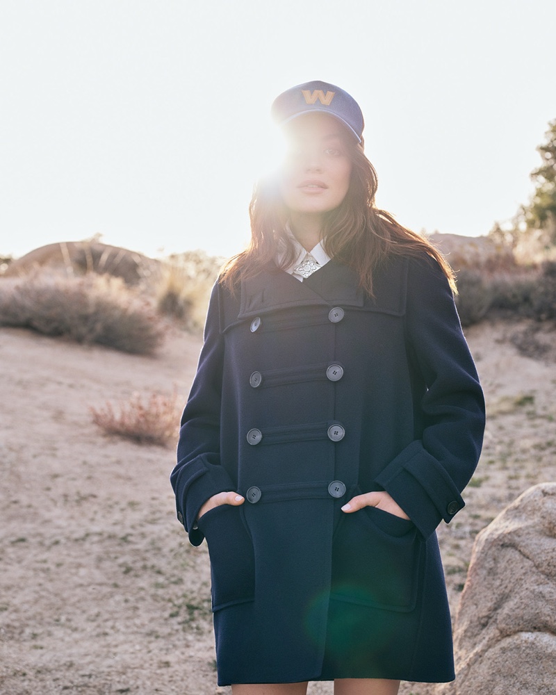 The collection's color palette is rustic, with earthy neutrals paired with vivid red and green hues. In an eye-catching ad campaign, Lucy looks stylish as she enjoys the sun-kissed ambiance in a desert setting.
